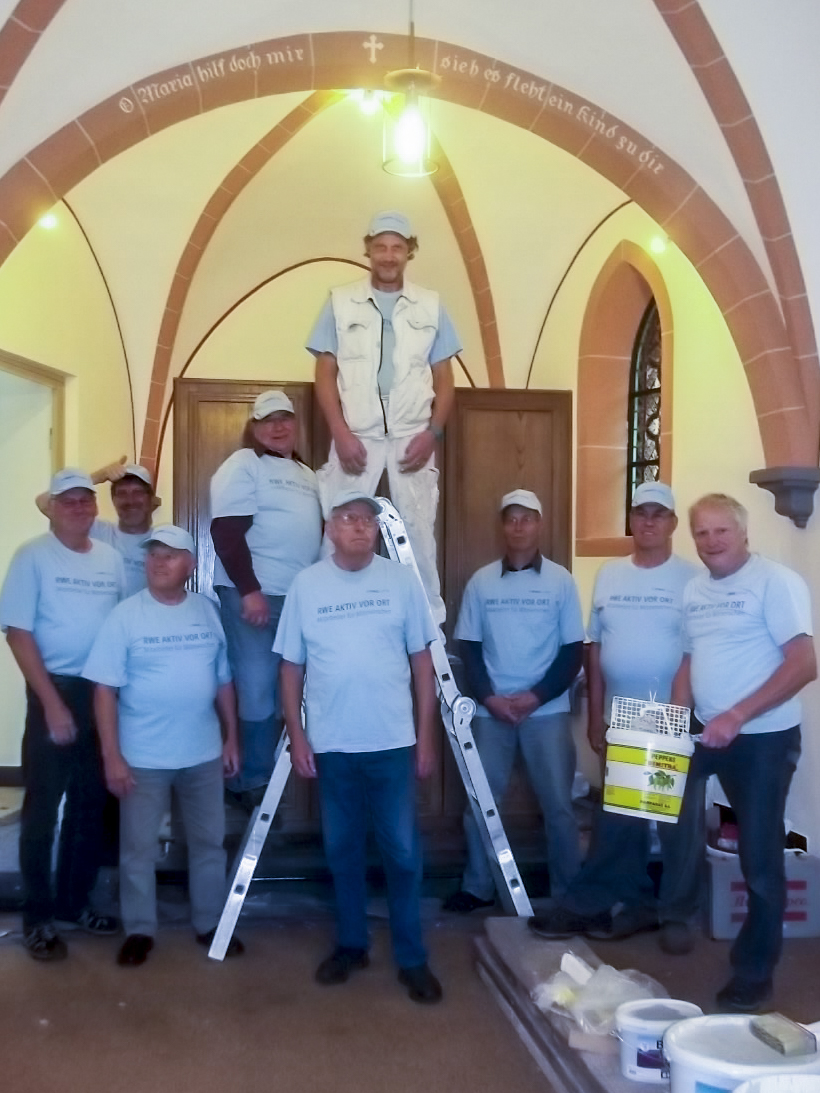 Der Innenanstrich der Kapelle ist in die Jahre gekommen und es war nun an der Zeit diese zu renovieren. Die Firma RWE sponserte die Materialkosten mit 1600 Euro. Die Arbeiten wurden in Eigenleistung ausgeführt. Der erste Vorsitzende des Kapellenvereins Hubert Hufschmidt, im Bild 4rter von links. konnte die Lorbacher für diese Arbeiten gewinnen. Insgesamt wendeten sie ca. 250 Stunden auf, um ihre Kapelle wieder "strahlen" zu lassen.